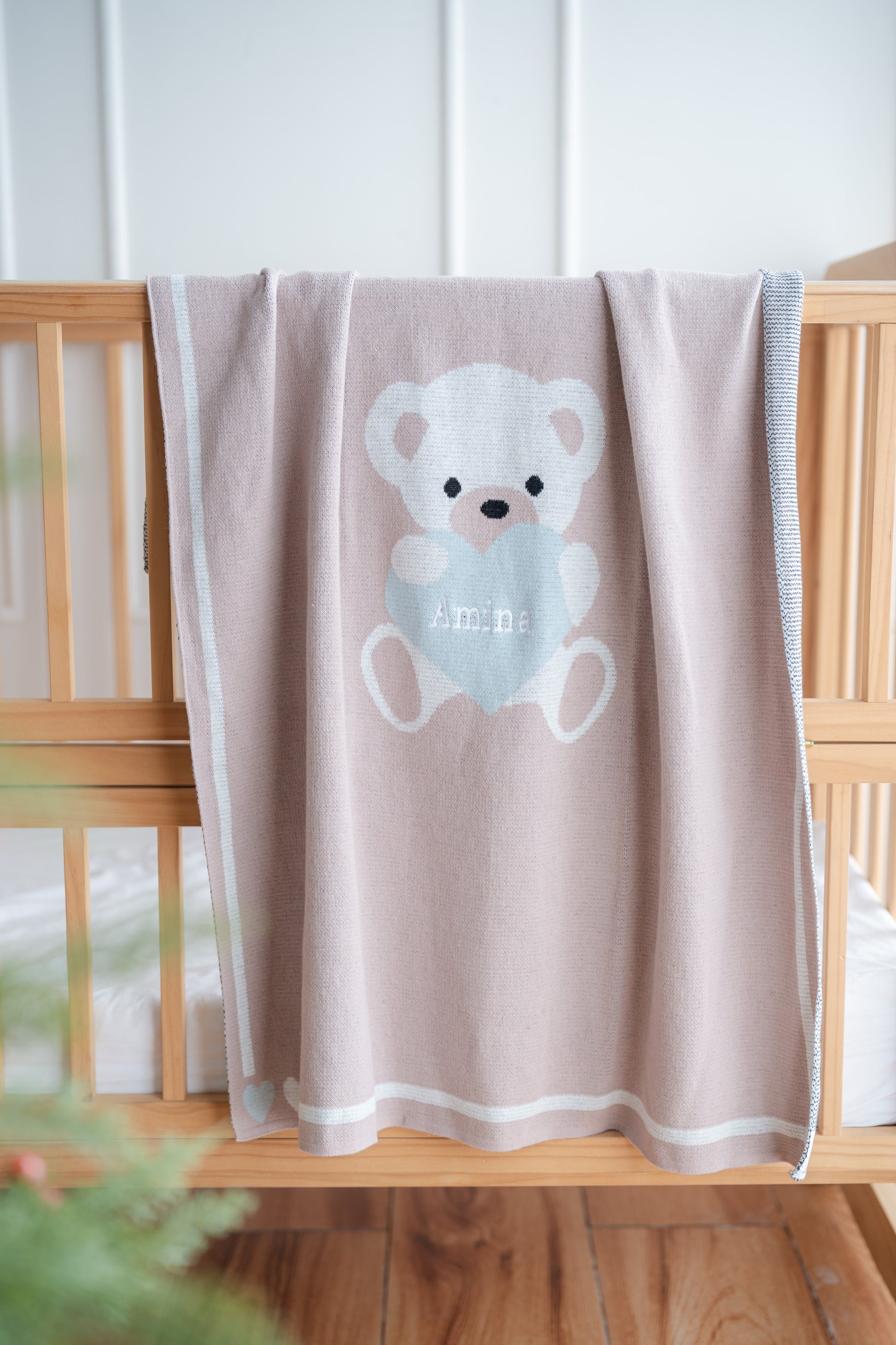 Wrap your little one in the sweetest comfort. The Teddy Heart Knit Blanket features a soft, cozy knit adorned with an adorable teddy holding a heart—made even more special with your baby’s name at the center. Its gentle neutral tones make it perfect for nurseries, stroller rides, and gifting.